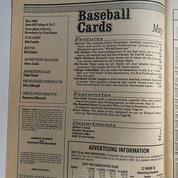 Baseball Cards Magazine May 1989 Darryl Strawberry w/Mint Cards - No Label EX