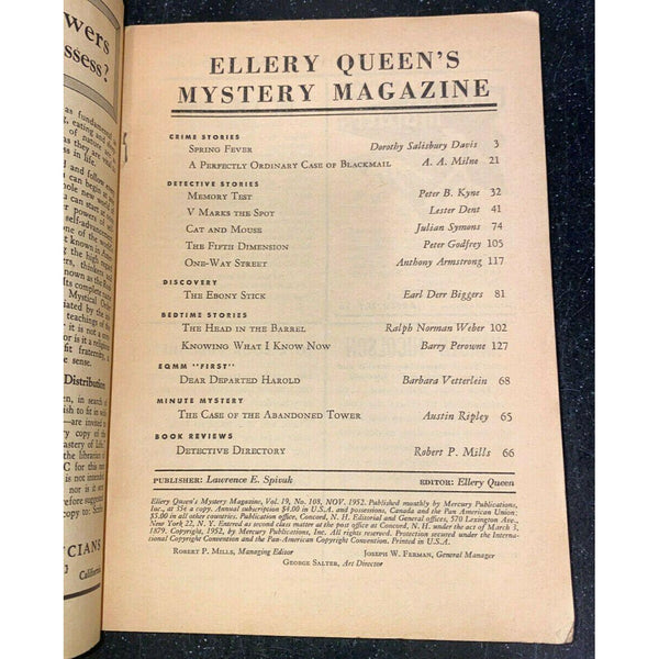 Ellery Queen's Mystery Magazine November 1952 Vol 19 No 108 Earl Derr Biggers