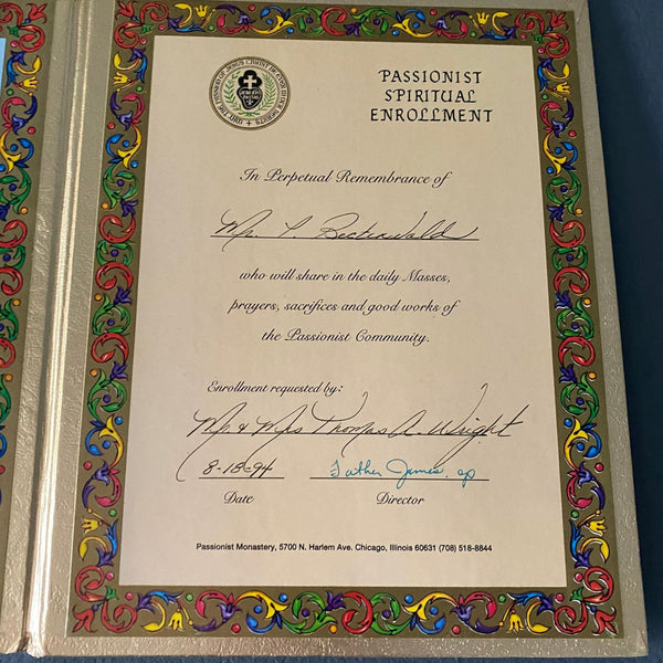 Passionist Spiritual Enrollment Monastery Chicago Certificate Vintage 1990s